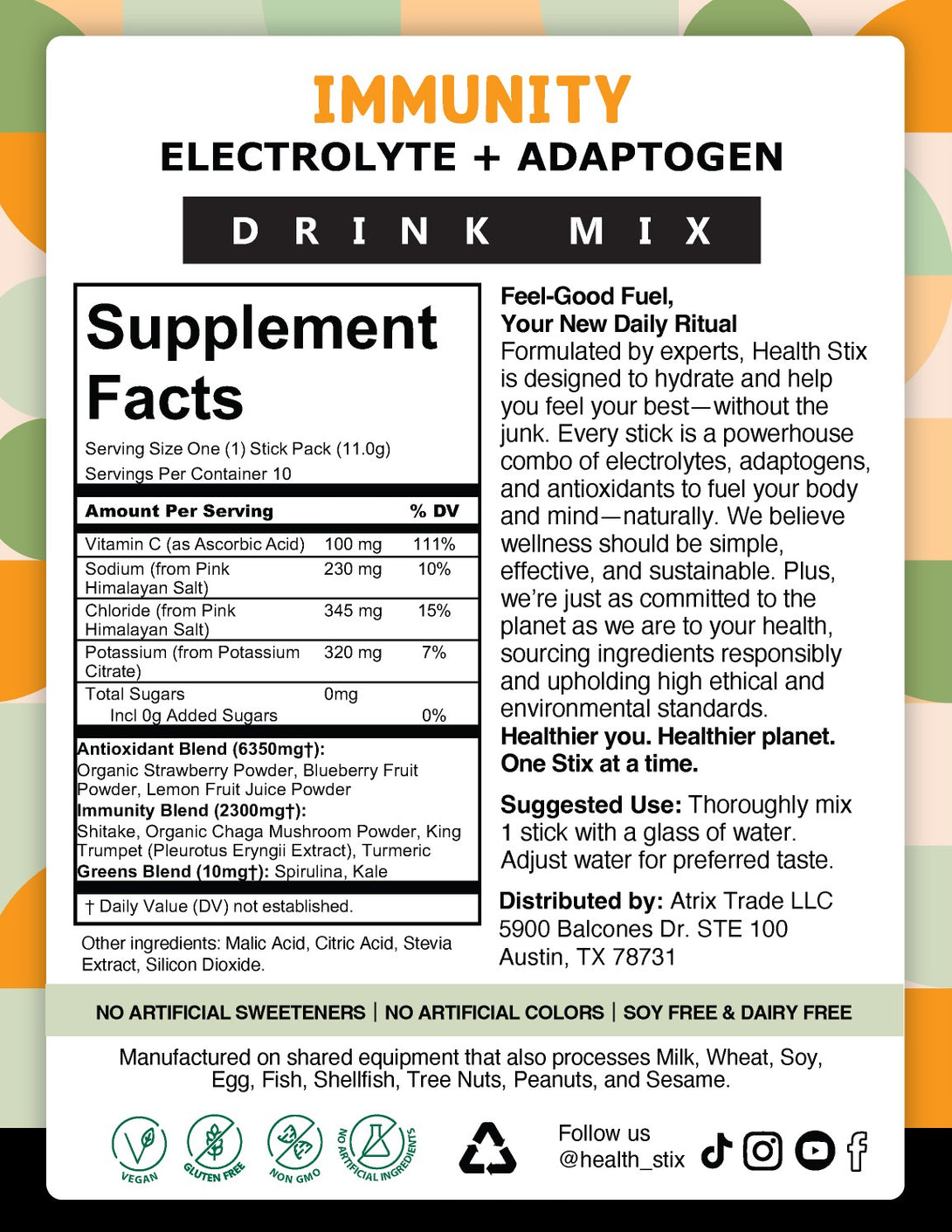 Fortify your body’s defenses with Immunity, our advanced blend designed to bolster your immune system and promote overall health. Packed with a potent combination of natural ingredients, this formula provides essential vitamins, minerals, and immune-supportive ingredients to help you stay resilient and strong. Whether you’re looking to enhance your daily wellness or need an extra boost during seasonal changes, Immunity HealthStix is your go-to solution. It’s crafted without artificial additives, ensuring you receive pure, effective support for your immune system health. Incorporate Immunity into your daily regimen and feel confident in your body’s ability to combat daily challenges and maintain optimal well-being.