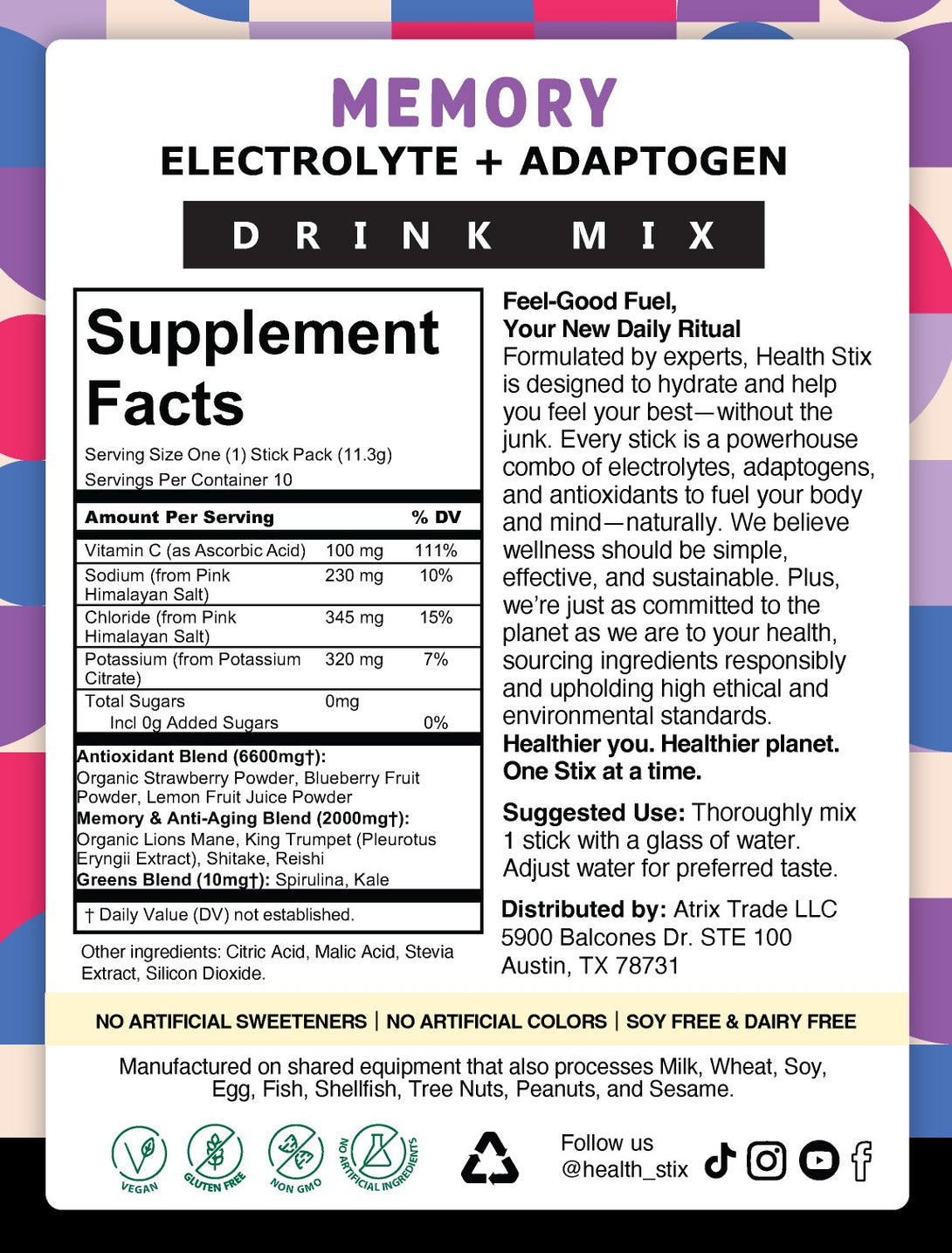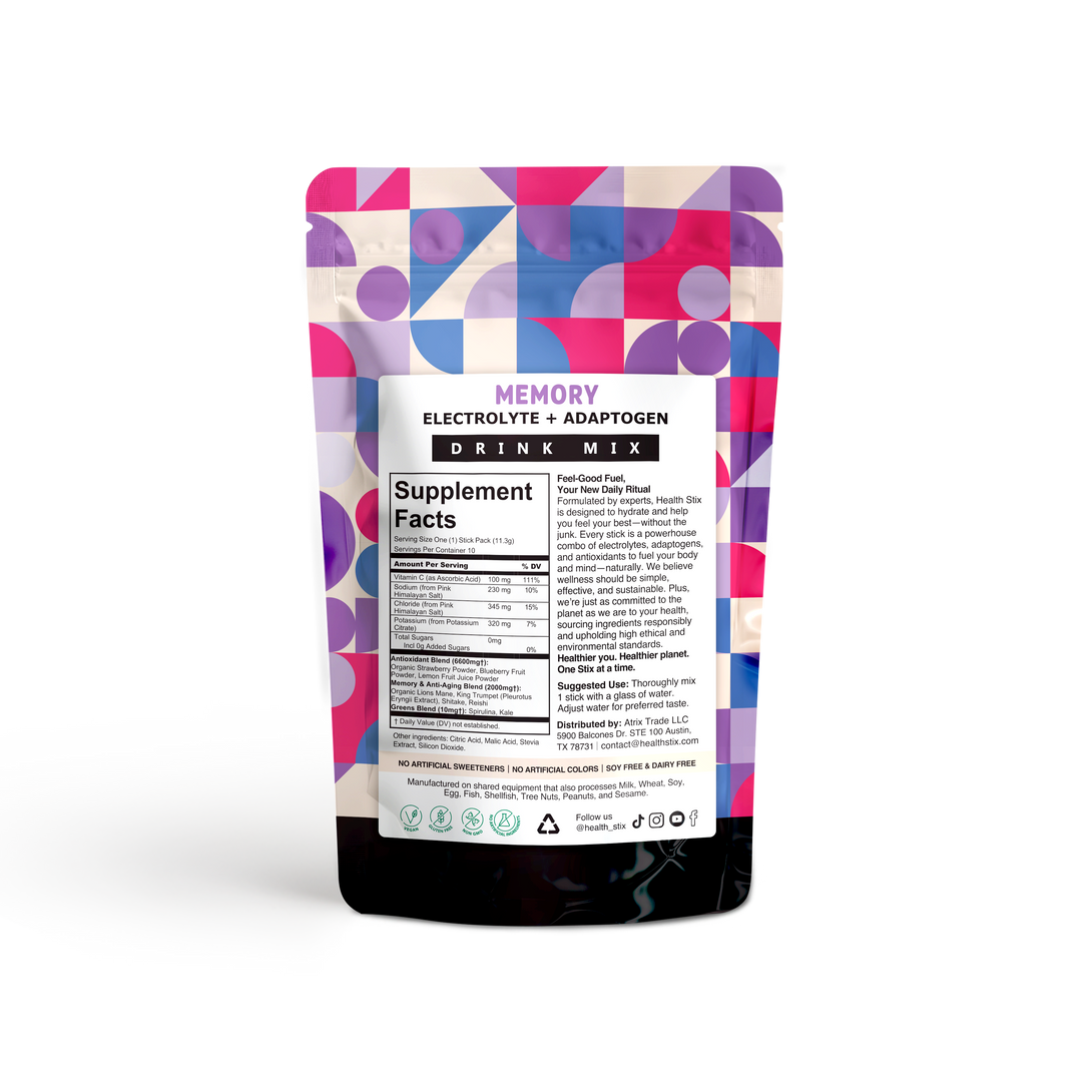 Unlock the secrets to a sharper mind and youthful vitality with our Memory & Anti-Aging blend. This advanced formula combines the power of electrolytes and adaptogens to support cognitive function, memory retention, and overall mental clarity. Enriched with key nutrients that promote brain health and combat the effects of aging, this mix helps you stay sharp and focused. Ideal for daily use, it’s designed to enhance your cognitive performance while maintaining your body’s natural balance. Enjoy the benefits of improved mental acuity and a more vibrant, youthful you with every serving. Free from artificial ingredients, our Memory & Anti-Aging mix delivers pure, effective support for your brain and body.