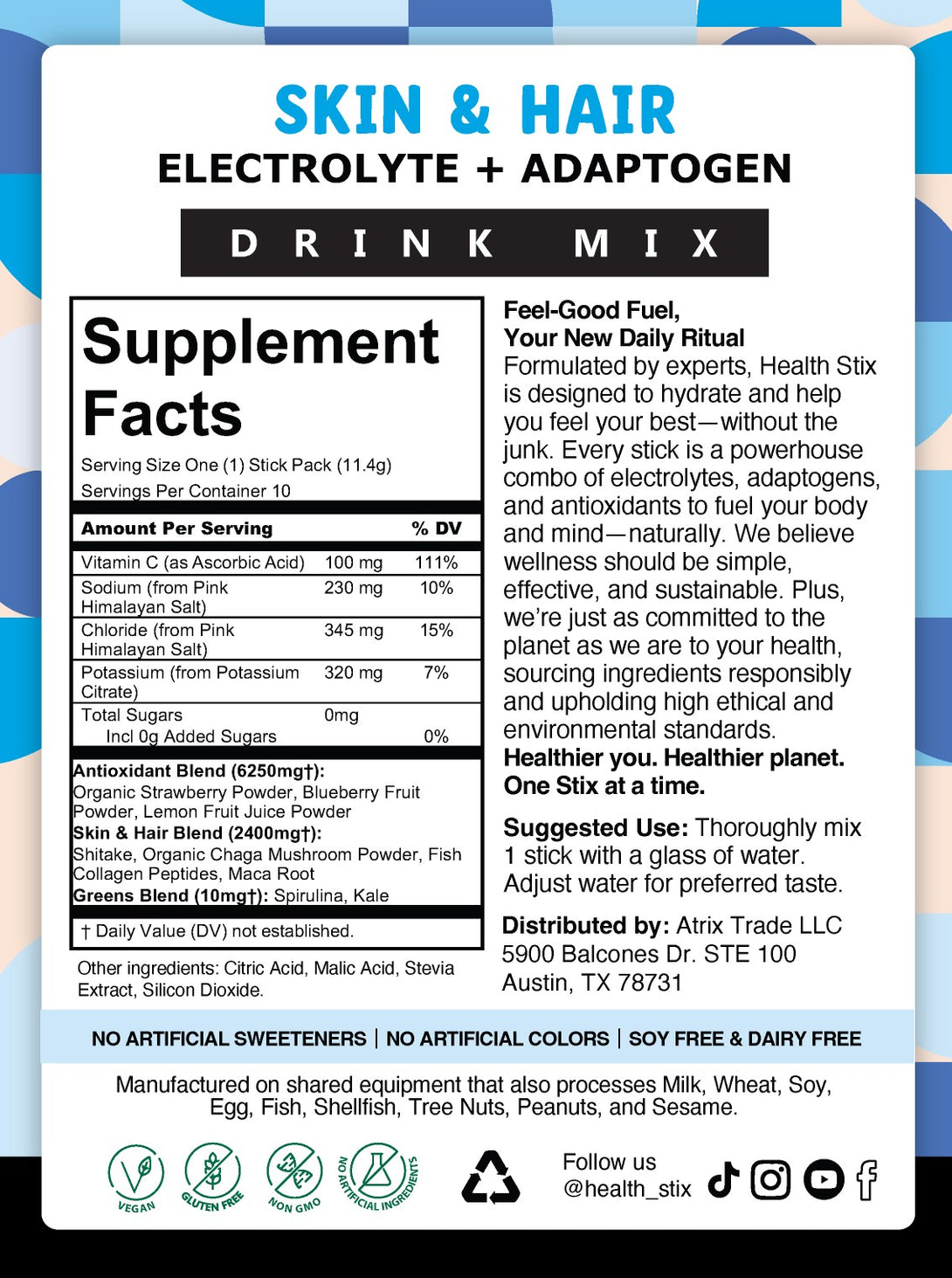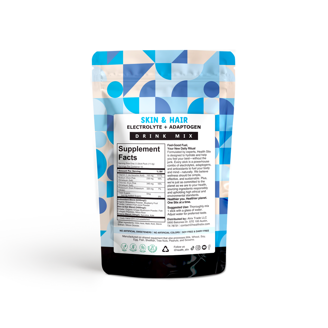Revitalize your body from the inside out with our Skin, Hair & Joints HealthStix, a comprehensive formula designed to support your natural beauty and joint health. This powerful mix combines essential electrolytes with potent adaptogens to nourish your skin, strengthen your hair, and maintain healthy joints. Formulated with ingredients known for their rejuvenating properties, this blend helps promote radiant skin, vibrant hair, and flexible joints. Ideal for daily use, it delivers targeted nutrients to support your overall wellness without artificial additives. Embrace a more youthful appearance and improved joint function with every serving of this exceptional mix.